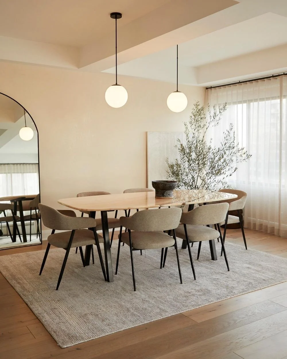 2 - L’utilisation d’un tapis dans la salle à manger est un vaste débat. D’un point de vue design et décorations, le tapis va te permettre de bien délimiter ton espace, surtout si ta salle à manger est dans une pièce ouverte. De plus, il permettra d’apporter de la chaleur à ton espace.