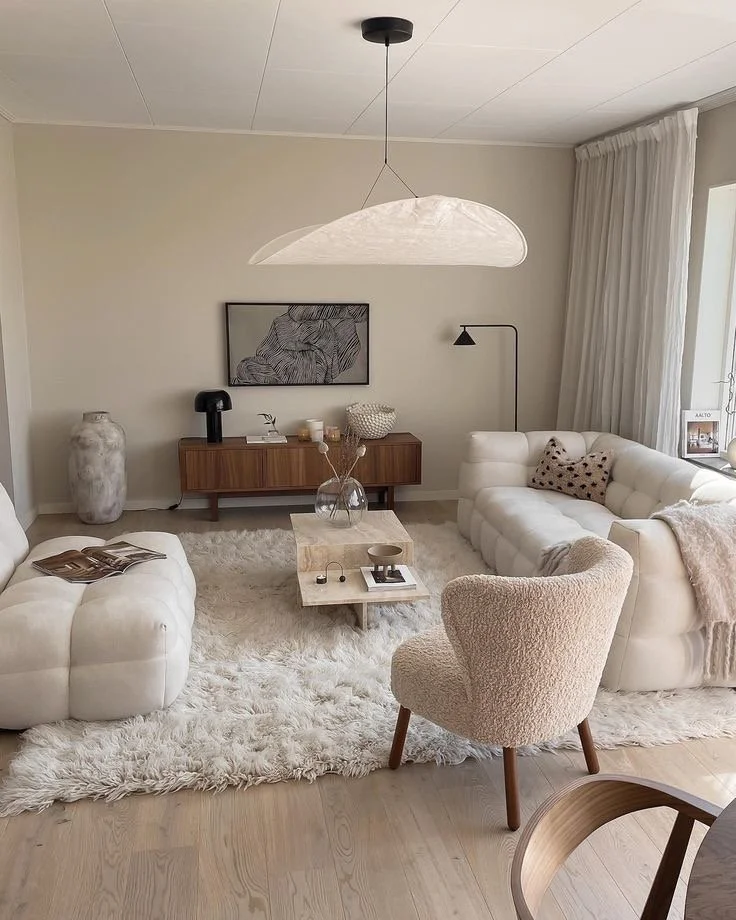 Pour un salon, les pieds de tes canapés, fauteuils, tables, etc. doivent se trouver sur le tapis.